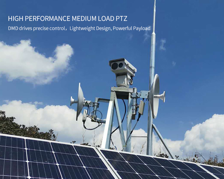 Mid-load multi-spectral PTZ, it can carry 3Kg on one side and be equipped with laser light, which observation distance is longer. Spur gear drive resists vibration and protects transmission. The DMD drive system responds quickly and runs smoothly at low speed. It can be widely used in forest fire prevention, border and coastal defense and other application scenarios.
